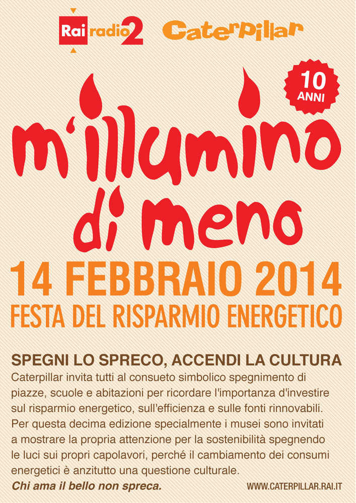 La Soprintendenza comunica di aver aderito all’iniziativa “M’illumino di meno. Festa del Risparmio Energetico”, che si terrà in data 14 febbraio 2014. L’iniziativa giunta ormai alla decima edizione, è lanciata dalla trasmissione radiofonica Caterpillar-Rai Radio2 per promuovere il risparmio energetico e la razionalizzazione dei consumi. Quest’anno lo slogan recita “Spegni lo spreco, accendi la cultura” a sottolineare come una nuova cultura dell’energia intelligente possa rendere disponibili nuove risorse per la conservazione e la valorizzazione del patrimonio culturale.